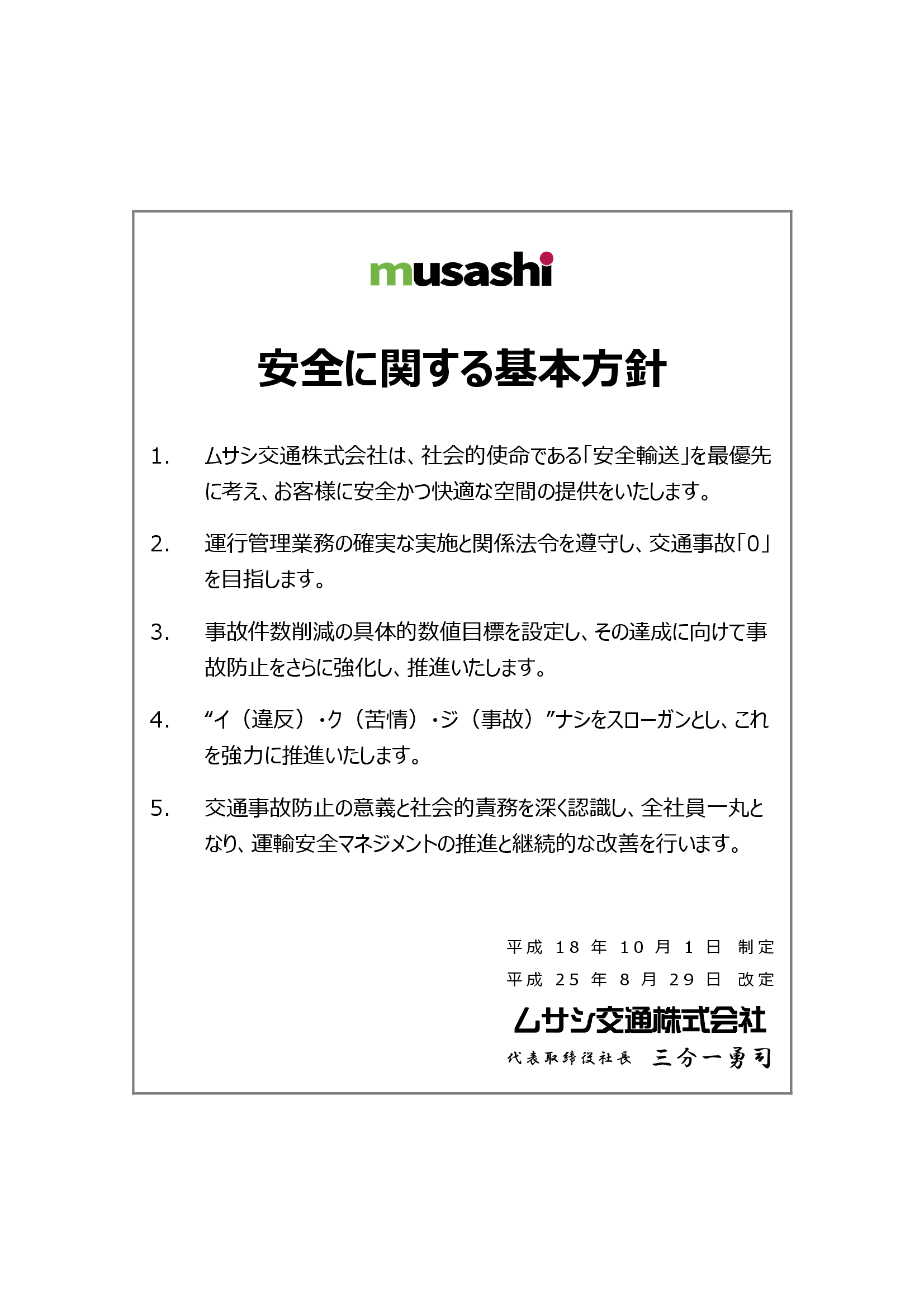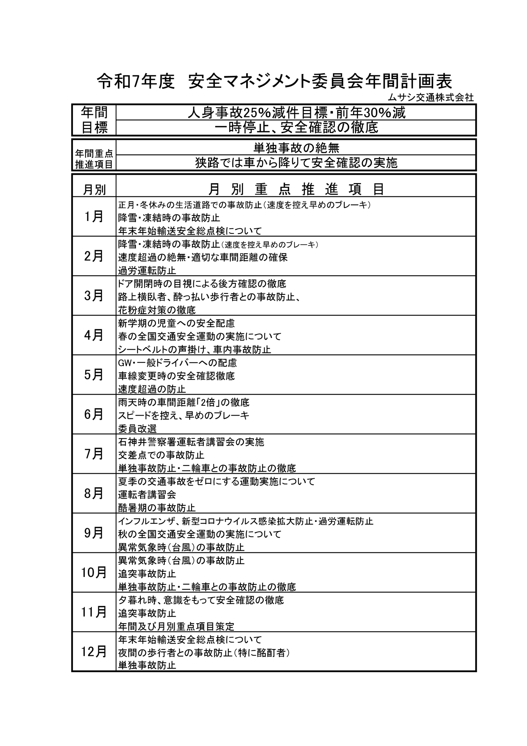 ムサシ交通株式会社では、令和7年度の安全マネジメント委員会年間計画を公開しました。 本計画では、「人身事故25%減」「安全確認の徹底」を年間目標に掲げ、 月ごとに重点推進項目を設定し、社員一人ひとりの安全意識向上と交通事故防止を図ります。 今後も地域社会に安心・安全な交通サービスを提供できるよう努めてまいります。