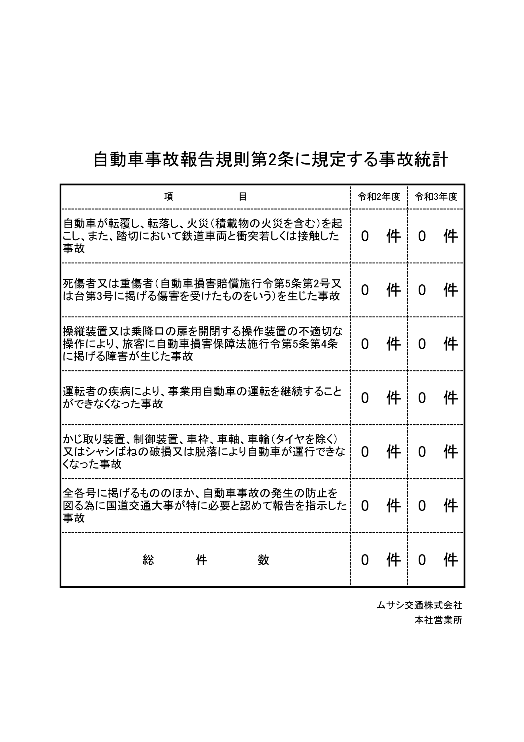 自動車事故報告規則第2条に規定する事故の統計は次の通りです。ムサシ交通株式会社では、国土交通省の定める「自動車事故報告規則第2条」に基づき、事故統計を管理しております。 令和2年度および令和3年度において、報告対象となる重大事故(転覆・火災・死亡・重傷事故等)は いずれも発生しておりません。 今後も引き続き、社員一人ひとりの安全意識の向上と徹底した安全管理に努め、無事故の継続を目指してまいります。